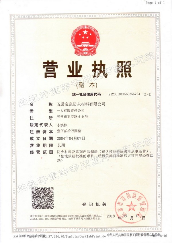 企業簡介 五常寶泉防火材料有限公司(黑龍江省寶泉消防設備有限公司)是主要制造、經營、銷售防火阻燃材料系列產品。其中以自粘性阻燃包帶(ZFBD)、阻火包(PFB)、有機防火堵料(SFD)、室內超薄型鋼結構防火涂料(NCB(BCF)-1)為主要產品。寶泉牌防火材料系列產品是普通防火材料的更新換代產品,防火性能優異,具有普通防火材料沒有的諸多優點:施工方便、經久耐用、耐火極限高、熱傳導率低、耐腐蝕、抗老化、無毒無害、環保、可以連續施工等特點。產品廣泛應用于電力企業(各型電廠、輸變電公司、電建公司、電力公司)、石油化工企業、冶金業、通訊業、地鐵、隧道、...